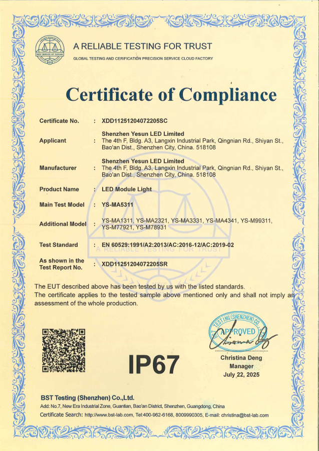 우리는 적분구, 염수 분무 시험기, 고온 습도 챔버를 포함한 전문적인 광학 및 환경 시험 시설을 보유하고 있습니다. 우리는 모든 배치의 발광 성능과 내구성을 체계적으로 검증합니다.